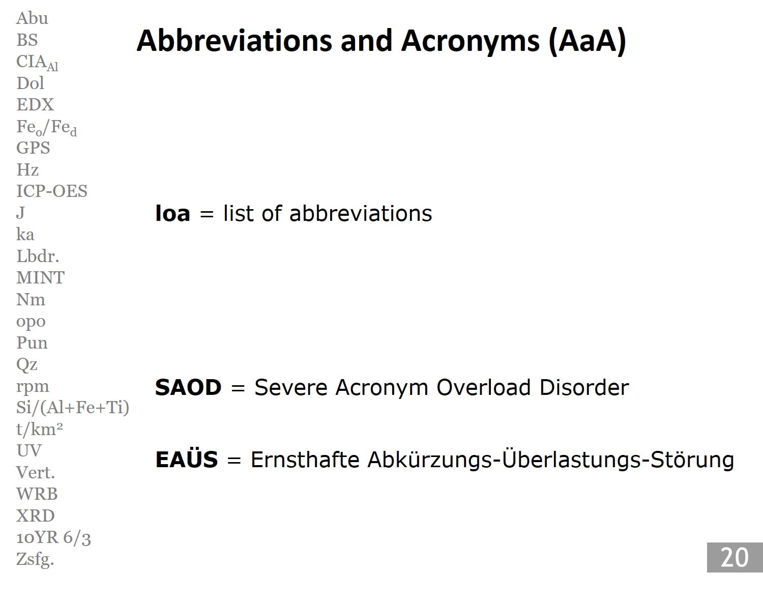 If your audience understands you in terms of acoustics and content, this is a good basis for a successful presentation. I myself have seen many speakers throwing abbreviations and acronyms around. Some of them are well known to most experts. The more specialized the audience is, the more catchy and familiar are the corresponding technical terms and abbreviations. Excessively used, however, the audience’s attention suffers because translating the abbreviations costs a lot of thought work. This is at the expense of concentration and attention. This is why I recommend to briefly explain abbreviations, acronyms and technical terms when mentioned for the first time.