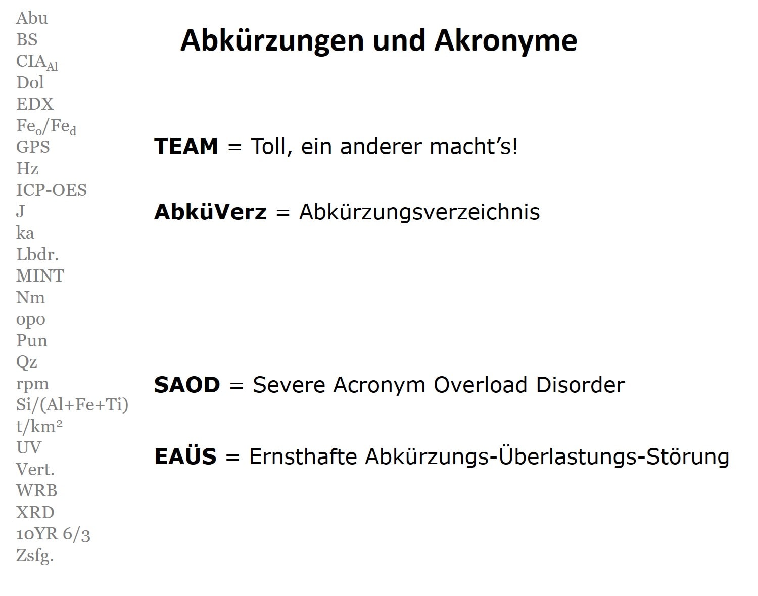 Wenn dein Publikum dich akustisch und inhaltlich versteht, schaffst du eine gute Grundlage für einen erfolgreichen Vortrag. Ich erlebe selbst viele Präsentationen, in denen Referenten mit Abkürzungen und Akronymen nur so um sich werfen. Einige davon sind den meisten Fachleuten sicher bekannt. Je spezialisierter das Publikum ist, umso eingängiger und vertrauter sind entsprechende Fachbegriffe und Abkürzungen. Exzessiv eingesetzt, leidet aber die Aufmerksamkeit der Zuhörer, weil die Übersetzung der Abkürzungen viel Denkarbeit kostet. Das geht zu Lasten der Konzentration und Aufmerksamkeit. Deshalb empfehle ich, Abkürzungen, Akronyme und Fachbegriffe kurz zu erläutern, wenn sie zum ersten Mal genannt werden.