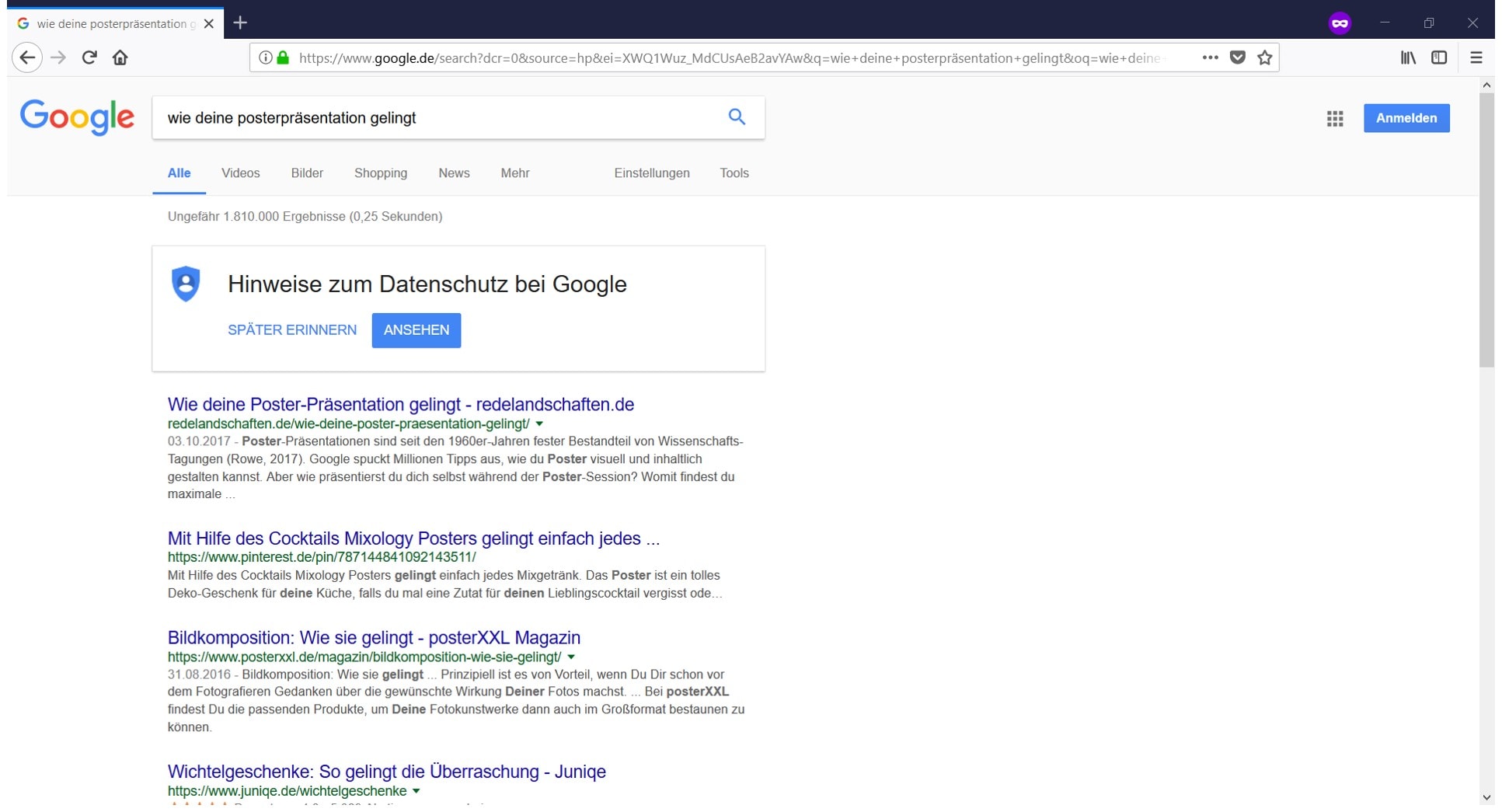 Das hebt dich von den meisten anderen ab und vermittelt im Idealfall nicht nur dein Fachwissen, sondern auch deine Offenheit und dein Interesse am Inhalt. In Kombination mit einem optisch ansprechend gestalteten und inhaltlich aktuellen Poster fällst du positiv auf und positionierst dich als Experte.
