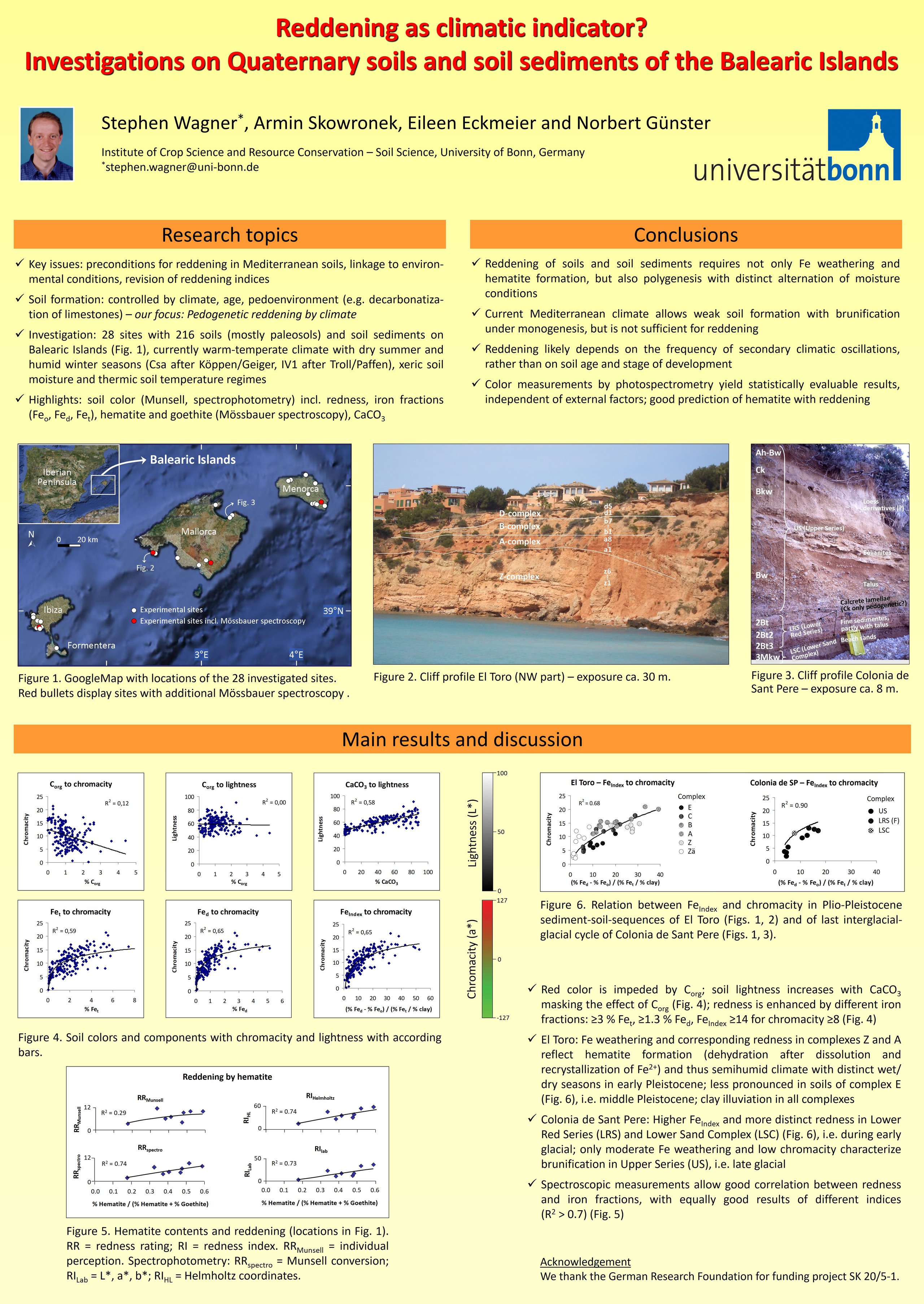 Mein Poster, mit dem ich die mit Abstand größte Aufmerksamkeit bekam, hatte den Titel „Reddening as climatic indicator? Investigations on Quaternary soils and soil sediments of the Balearic Islands”. Speziell die einleitende Frage hat zahlreiche – mir bis dato noch nicht bekannte – Kollegen angezogen, so dass wir die Titelfrage ausgiebig diskutiert haben, bis weit über die Poster-Session hinaus.